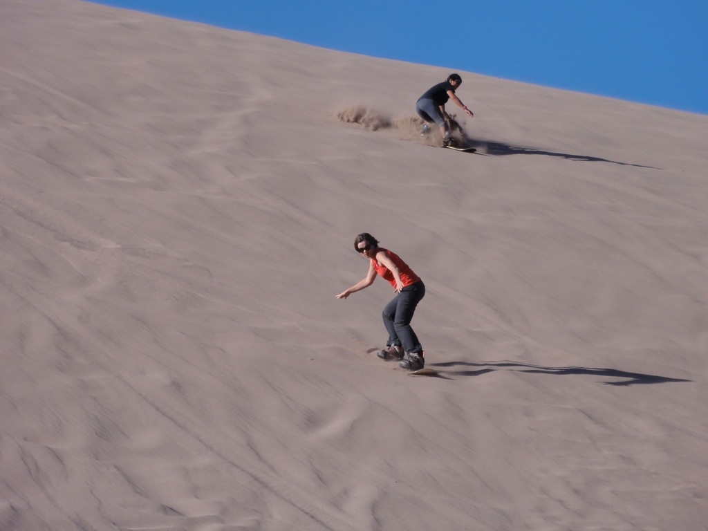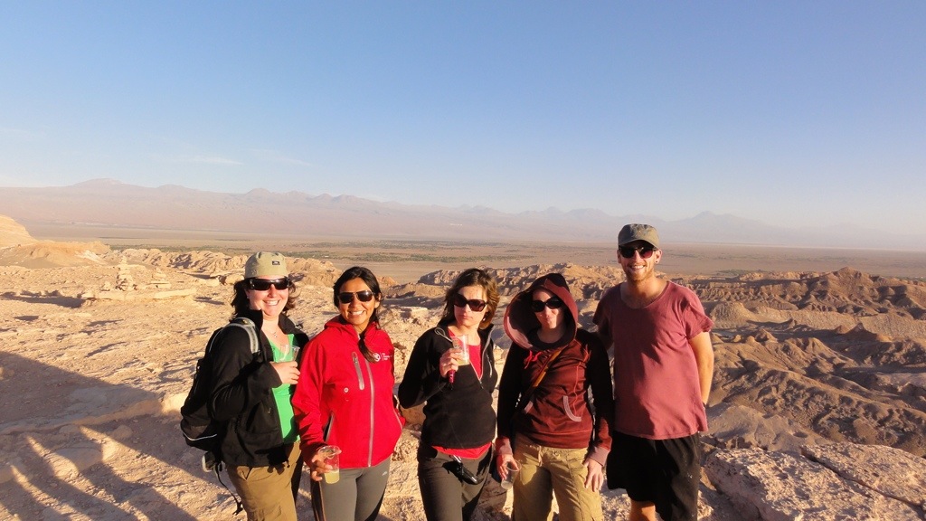 Once merely a stop on the Andean cattle drive, San Pedro de Atacama (2440 metres) is now a small adobe town crammed with hostels, hotels, pricey restaurants, cafes and a zillion tour operators! The surrounding desert area is full of options from Horseriding, mountain biking, trekking and sand boarding. We all went sand boarding in death valley on our first afternoon, and it was AWESOME DUDES! I say that, and yes the sand boarding itself was great, but walking up the sand dunes to the top was an absolute killer in 30+ degrees! The landscape made up for it, and considering it was a first for us all think we did pretty good. We collectively agreed that we don’t particularly enjoy the taste of sand though. We then headed to the “Valley of the moons” to watch the sunset with a Pisco Sour. It was beautiful, but we were far from the only ones there….seemed like half the town was on the cliff with us! We picked up some empanadas for dinner and sank a bottle of the Pisco, mixed with soda, lemonade and fresh limes. We all slept well following the night bus, sand boarding and Pisco!